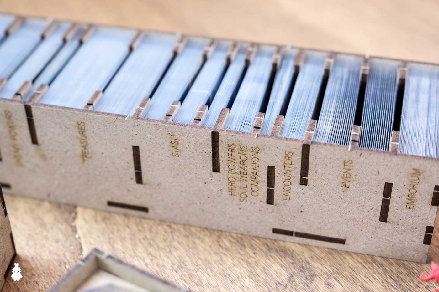 2x portacarte con slot dedicati e divisori rimovibili, con spazio per gioco base ed espansioni;